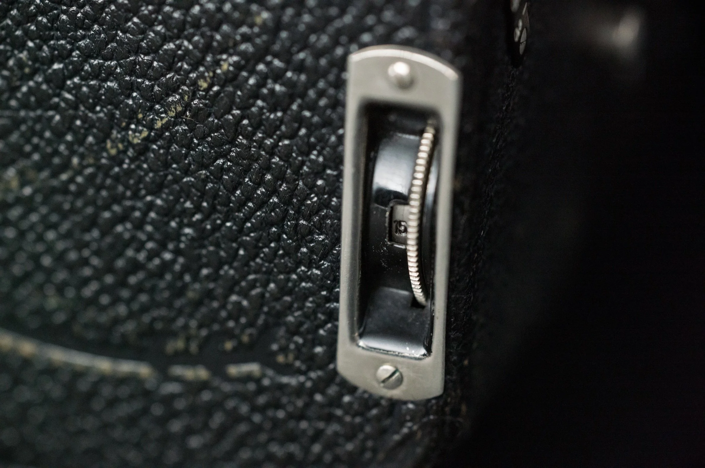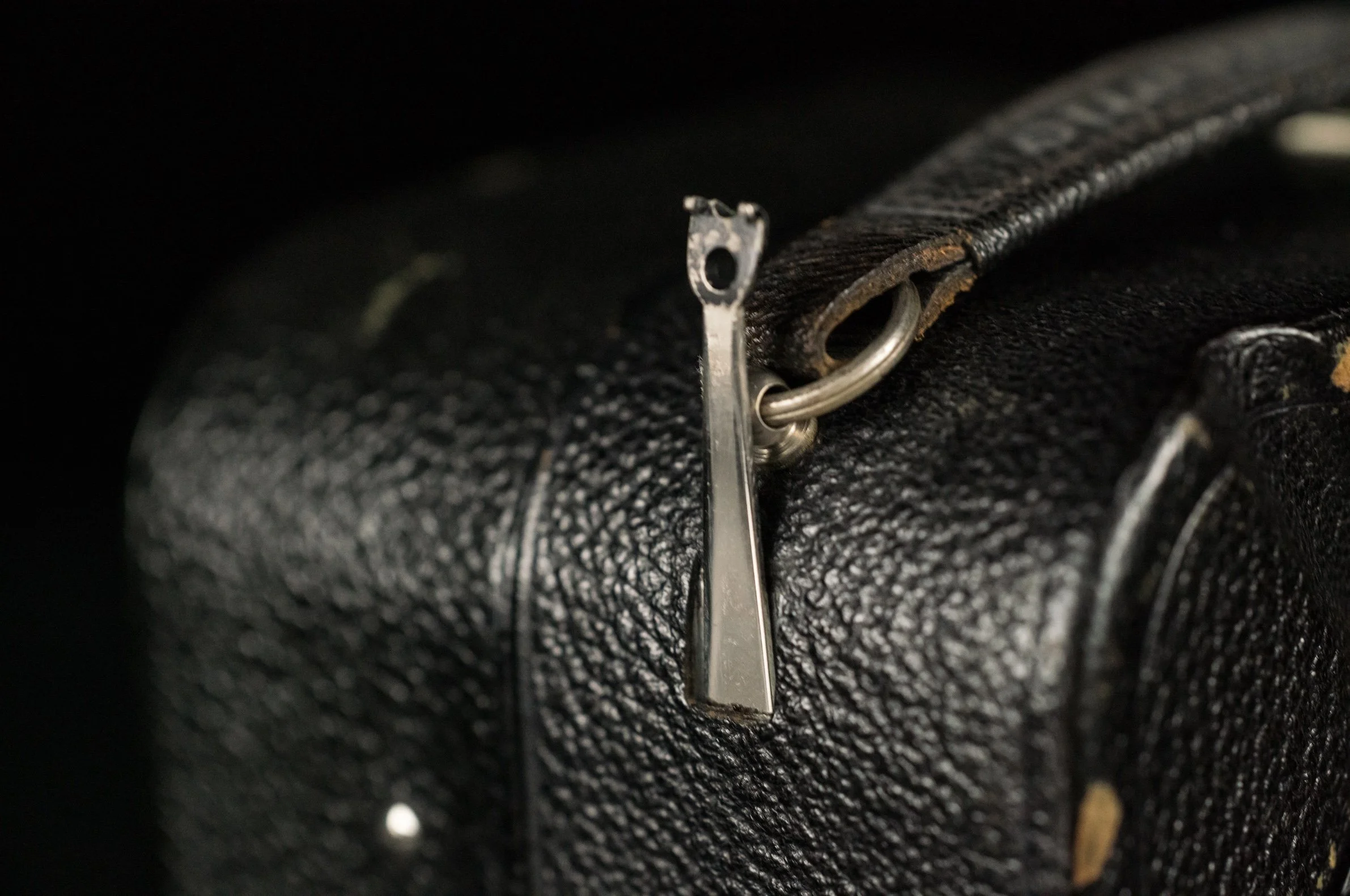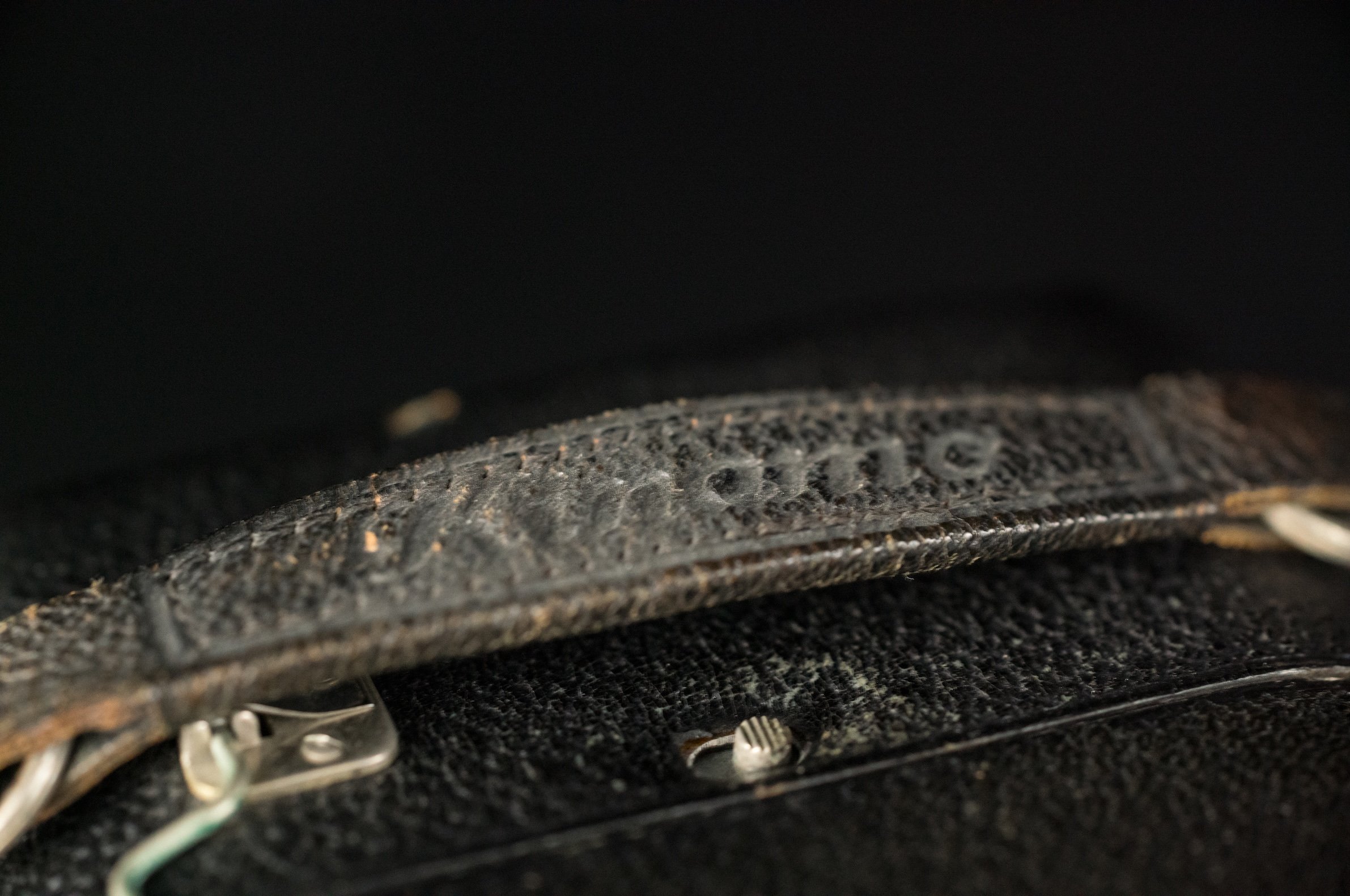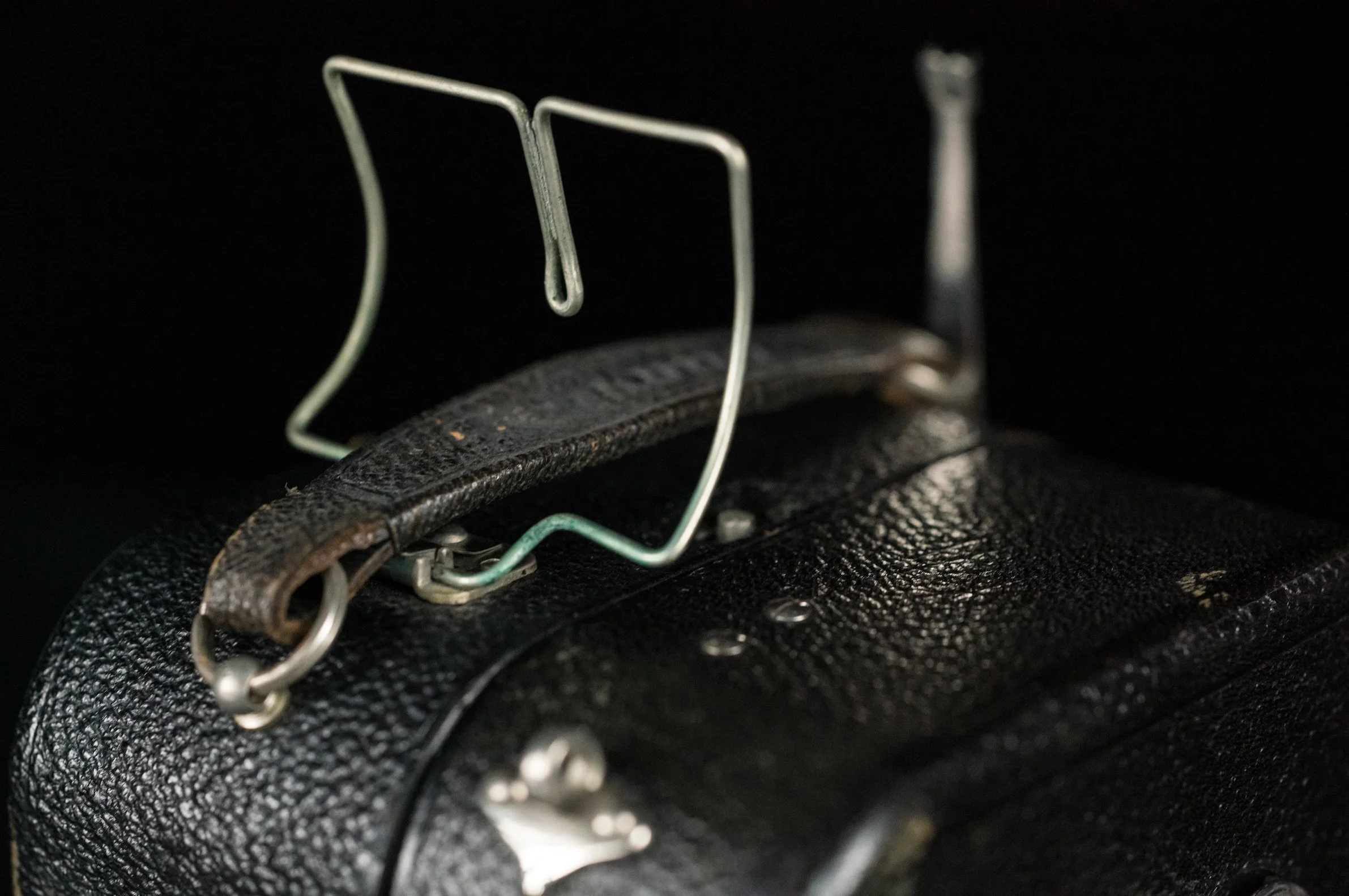 A delayed-action release allowed the camera operator to step in front of the lens before filming began — you placed a scrap of paper or a leaf in a small clamp on the front of the camera. When the mechanism released, the paper fluttered to the ground as a visual signal that filming was about to start